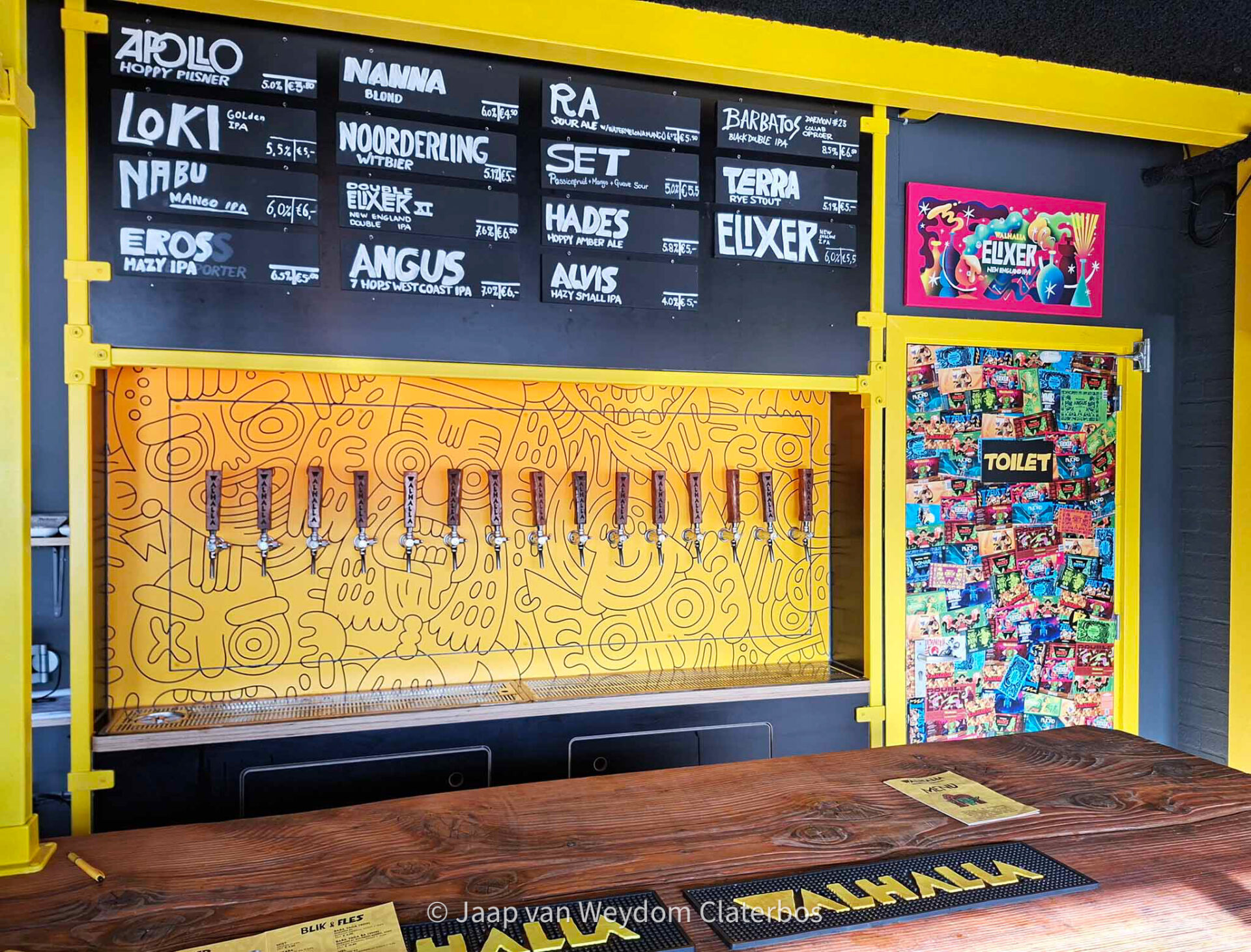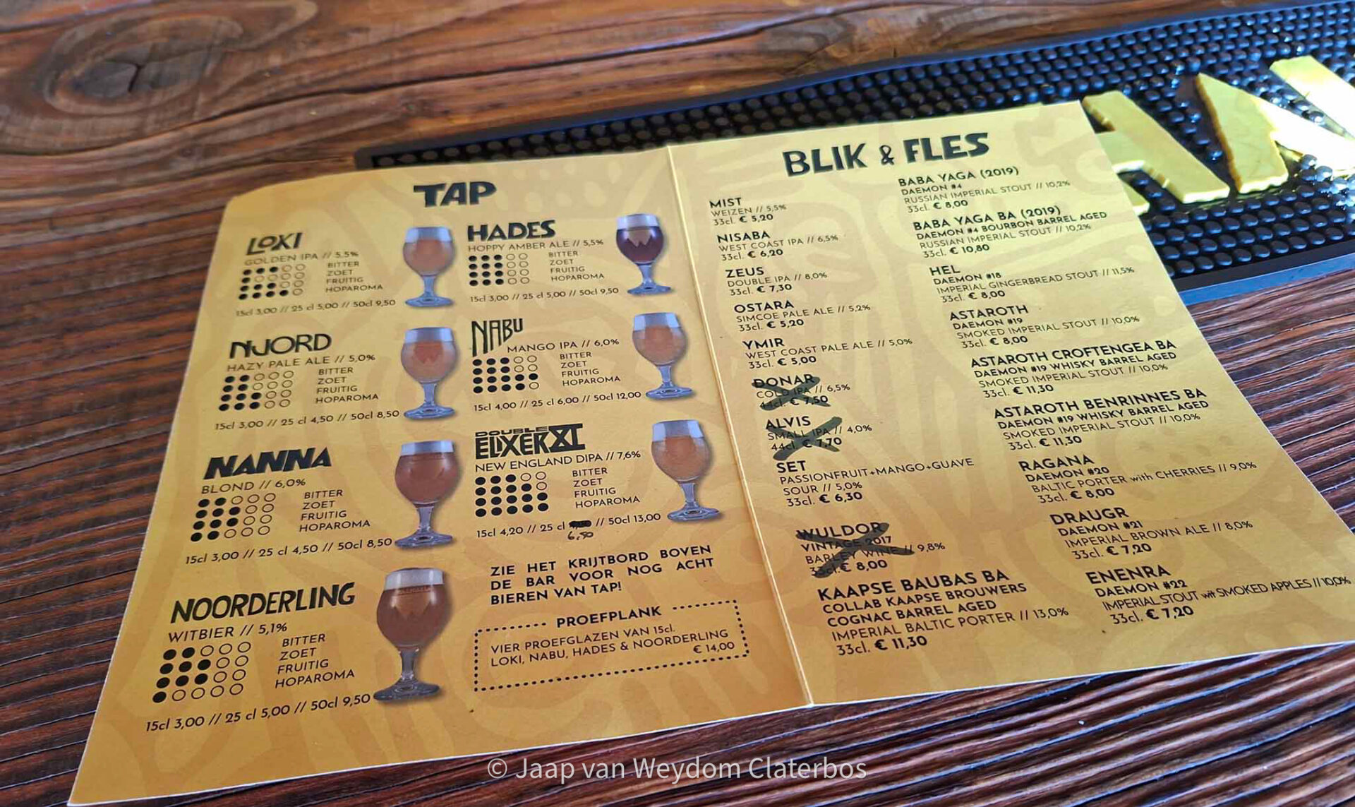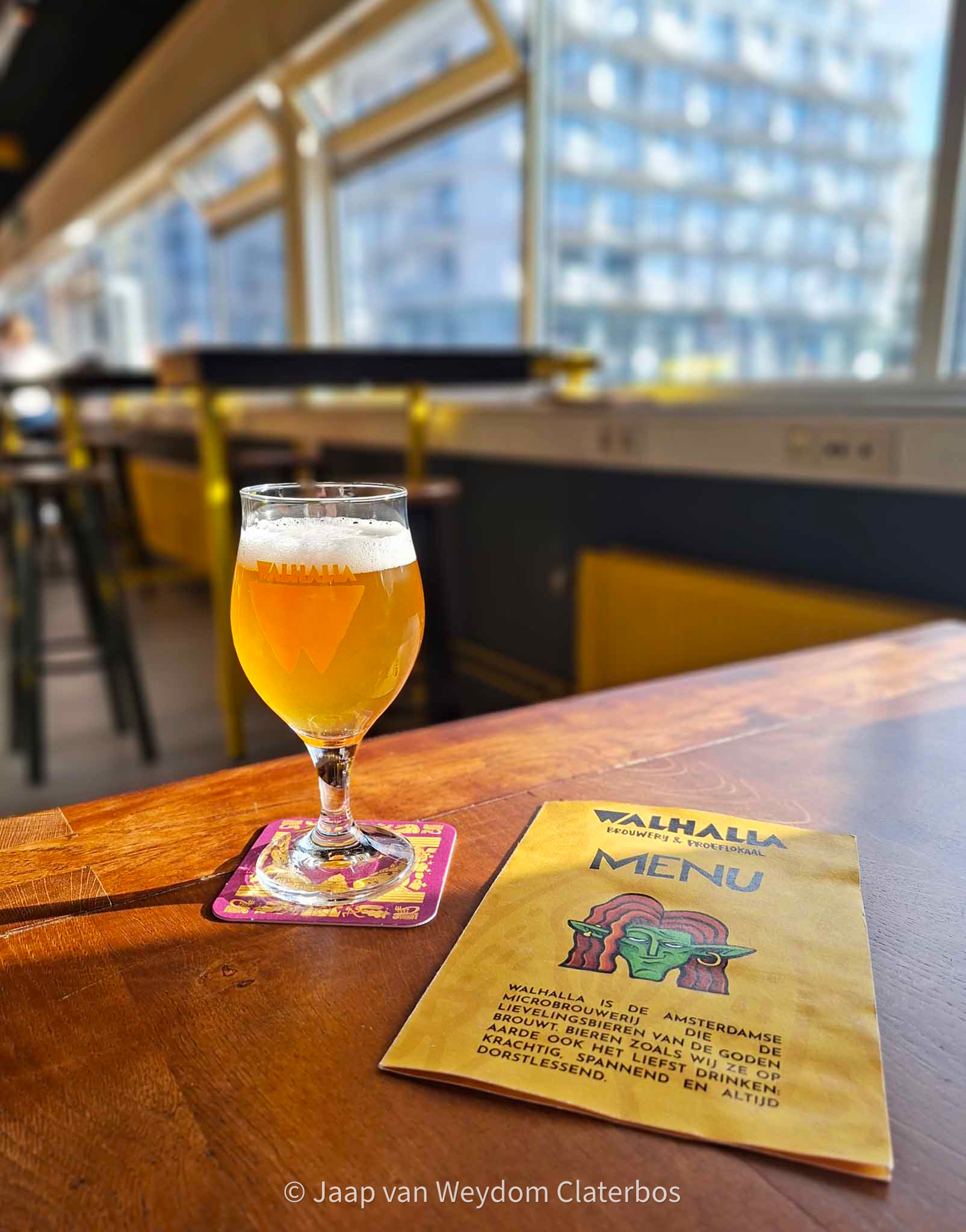 barvrouw gemaakt en mijn visitekaartje gegeven. Ze vertelde dat de bieren voorlopig bij Poesiat & Kater worden gebrouwen totdat de fundering in de brouwzaal sterk genoeg is om de zware brouwketels te kunnen dragen. In december ’24 moesten ze van hun geliefde plek aan de Spijkerkade afscheid nemen. Ze kunnen gelukkig in Amsterdam-Noord blijven en zitten nu nog dichter bij het CS. Eén van de vrienden was ons vooruitgesneld op de fiets om niet terug te hoeven lopen. Hij zat al binnen en had een vrije tafel kunnen bemachtigen. De zon scheen naar binnen en verwarmde ons aangenaam. Een blik op de menukaart en het krijtbord boven de tapkranen liet zien dat Walhalla liefhebbers is van IPA’s. Maar liefst 8 van de 15 tapbieren zijn IPA’s.