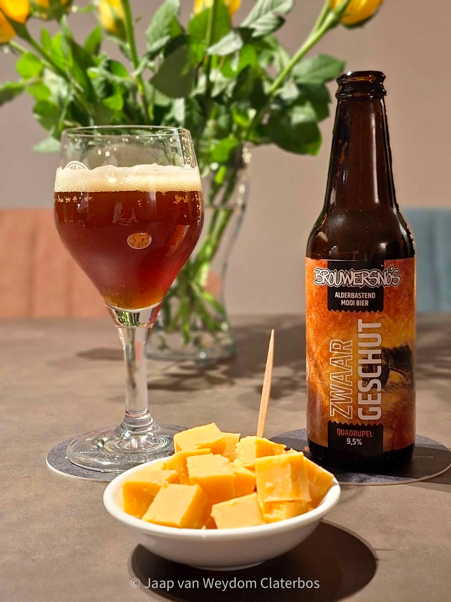 Twee Quadrupel bij Mitra Almere Buiten gekocht. Julequad van Brouwerij Nønge Ø. Een vrij alcoholische quadrupel. En Zwaar Geschut van Craftbier Brouwerij Brouwernös (Twents voor brouwersnest). Deze was andere koek. Amber oranjebruin licht wazig van kleur. Geen alcoholische geur en smaak. Volgens de brouwerij zelf: “Prijswinnend quadrupel van alc. 9,5% vol. met een warme touch van honing en karamel." Blokjes oude kaas erbij, top!